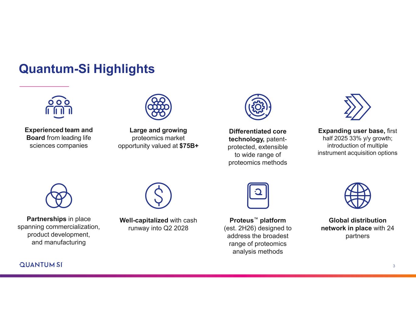 2 Disclaimer and Other Information Forward-looking Statements This presentation includes "forward-looking statements" within the meaning of the "safe harbor" provisions of the United States Private Securities Litigation Reform Act of 1995. The actual results of Quantum-Si Incorporated (the “Company”) may differ from its expectations, estimates, and projections and, consequently, you should not rely on these forward-looking statements as predictions of future events. Words such as "expect," "estimate," "project," "budget," "forecast," "anticipate," "intend," "plan," "may," "will," "could," "should," "believes," "predicts," "potential," "continue," and similar expressions (or the negative versions of such words or expressions) are intended to identify such forward-looking statements. These forward-looking statements include, without limitation, the Company's expectations with respect to future performance and development and commercialization of products and services, its anticipated cash runway and any financial guidance for the interim periods and full year 2025. These forward-looking statements involve significant risks and uncertainties that could cause the actual results to differ materially from those discussed in the forward- looking statements. Most of these factors are outside the Company's control and are difficult to predict. Factors that may cause such differences include, but are not limited to: the inability to maintain the listing of the Company's Class A common stock on The Nasdaq Stock Market; the ability of the Company to grow and manage growth profitably and retain its key employees; the Company’s ongoing leadership transitions; changes in applicable laws or regulations; the ability of the Company to raise financing in the future; the success, cost and timing of the Company's product development and commercialization activities; the commercialization and adoption of the Company’s existing products and the success of any product the Company may offer in the future; the potential attributes and benefits of the Company’s commercialized Platinum® line of protein sequencing instruments and kits and the Company’s other products once commercialized; the Company's ability to obtain and maintain regulatory approval for its products, and any related restrictions and limitations of any approved product; the Company's ability to identify, in-license or acquire additional technology; the Company's ability to maintain its existing lease, license, manufacture and supply agreements; the Company's ability to compete with other companies currently marketing or engaged in the development or commercialization of products and services that serve customers engaged in proteomic analysis, many of which have greater financial and marketing resources than the Company; the size and growth potential of the markets for the Company's products and services, and its ability to serve those markets once commercialized, either alone or in partnership with others; the Company's estimates regarding future expenses, future revenue, capital requirements and needs for additional financing; the Company's financial performance; and other risks and uncertainties described under "Risk Factors" in the Company’s most recent Annual Report on Form 10-K, and in the Company's other filings with the SEC. The Company cautions that the foregoing list of factors is not exclusive. The Company cautions readers not to place undue reliance upon any forward-looking statements, which speak only as of the date made. The Company does not undertake or accept any obligation or undertaking to release publicly any updates or revisions to any forward-looking statements to reflect any change in its expectations or any change in events, conditions, or circumstances on which any such statement is based. Non-GAAP Financial Measures This presentation includes certain non-GAAP financial measures including “adjusted total operating expenses.” Please see Exhibit 99.2 to the Company’s Current Report on Form 8-K filed with the SEC on August 5, 2025, for further discussion of the Company’s use of non-GAAP financial measures.