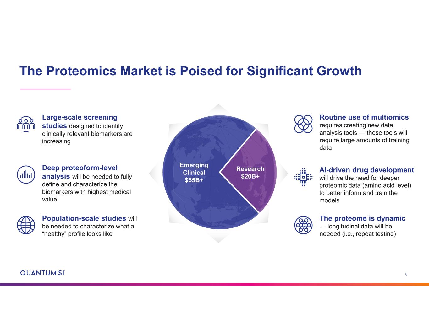 7 $75B+ Proteomics Market1 ~$8B+ Initial Target Market2 Proteomics is a Large and Growing Market Opportunity Identification $3B+ Expression + Quantification $3B+ Proteoforms + PTMs $1.5B+ 1. SVB Leerink Research, “Proteomics: The Next Frontier in Life Science Tools and Diagnostics.” September 28, 2021 2. DeciBio Consulting Evaluation, June 2020 Research $20B+ Emerging Clinical $55B+