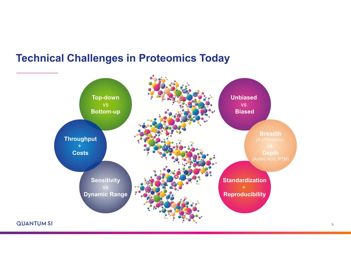 8 The Proteomics Market is Poised for Significant Growth The proteome is dynamic — longitudinal data will be needed (i.e., repeat testing) Routine use of multiomics requires creating new data analysis tools — these tools will require large amounts of training data Large-scale screening studies designed to identify clinically relevant biomarkers are increasing Deep proteoform-level analysis will be needed to fully define and characterize the biomarkers with highest medical value Population-scale studies will be needed to characterize what a “healthy” profile looks like Research $20B+ Emerging Clinical $55B+ AI-driven drug development will drive the need for deeper proteomic data (amino acid level) to better inform and train the models