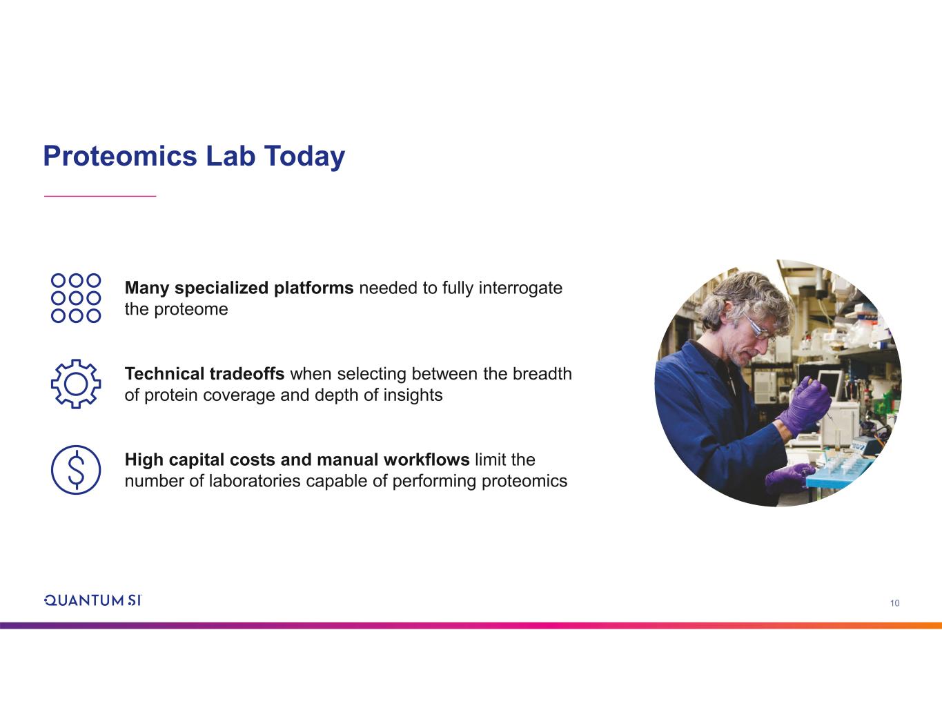 10 Proteomics Lab Today Many specialized platforms needed to fully interrogate the proteome Technical tradeoffs when selecting between the breadth of protein coverage and depth of insights High capital costs and manual workflows limit the number of laboratories capable of performing proteomics