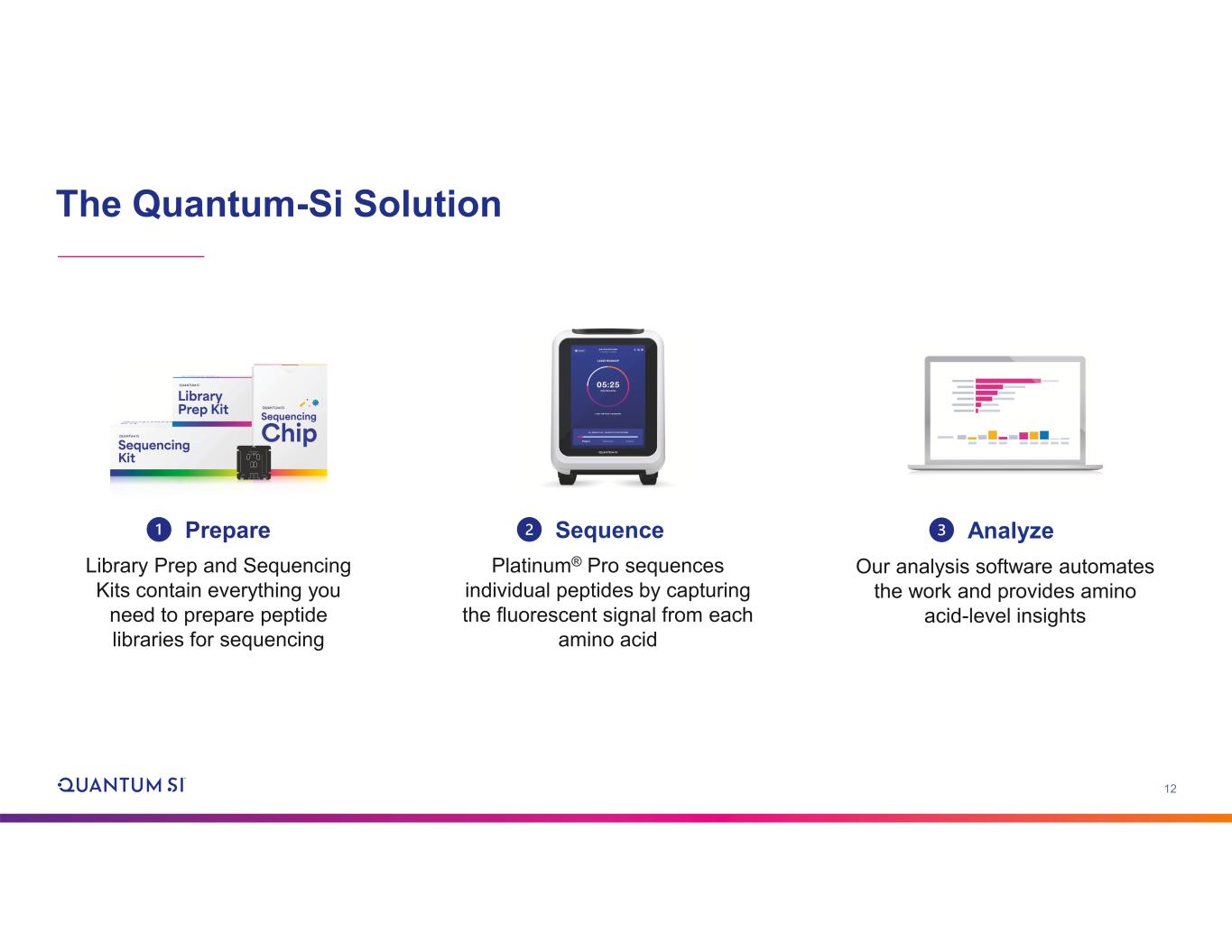 12 The Quantum-Si Solution Platinum® Pro sequences individual peptides by capturing the fluorescent signal from each amino acid Sequence Analyze Our analysis software automates the work and provides amino acid-level insights Library Prep and Sequencing Kits contain everything you need to prepare peptide libraries for sequencing Prepare