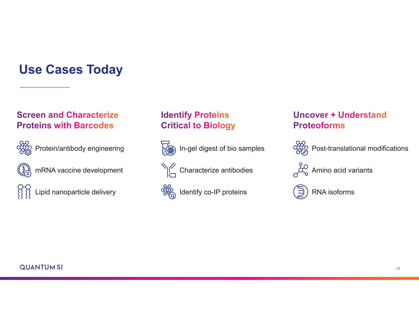 13 Our Instrument: Platinum® Pro Streamlined workflow • More efficient; less user time Pro Mode • Enables custom applications of core technology • Accelerates research with QSI’s Technology Access Program Onboard analysis capability • Allows for offline processing and analysis • Flexibility to conduct analysis via cloud Enhanced user interface • More data at fingertips
