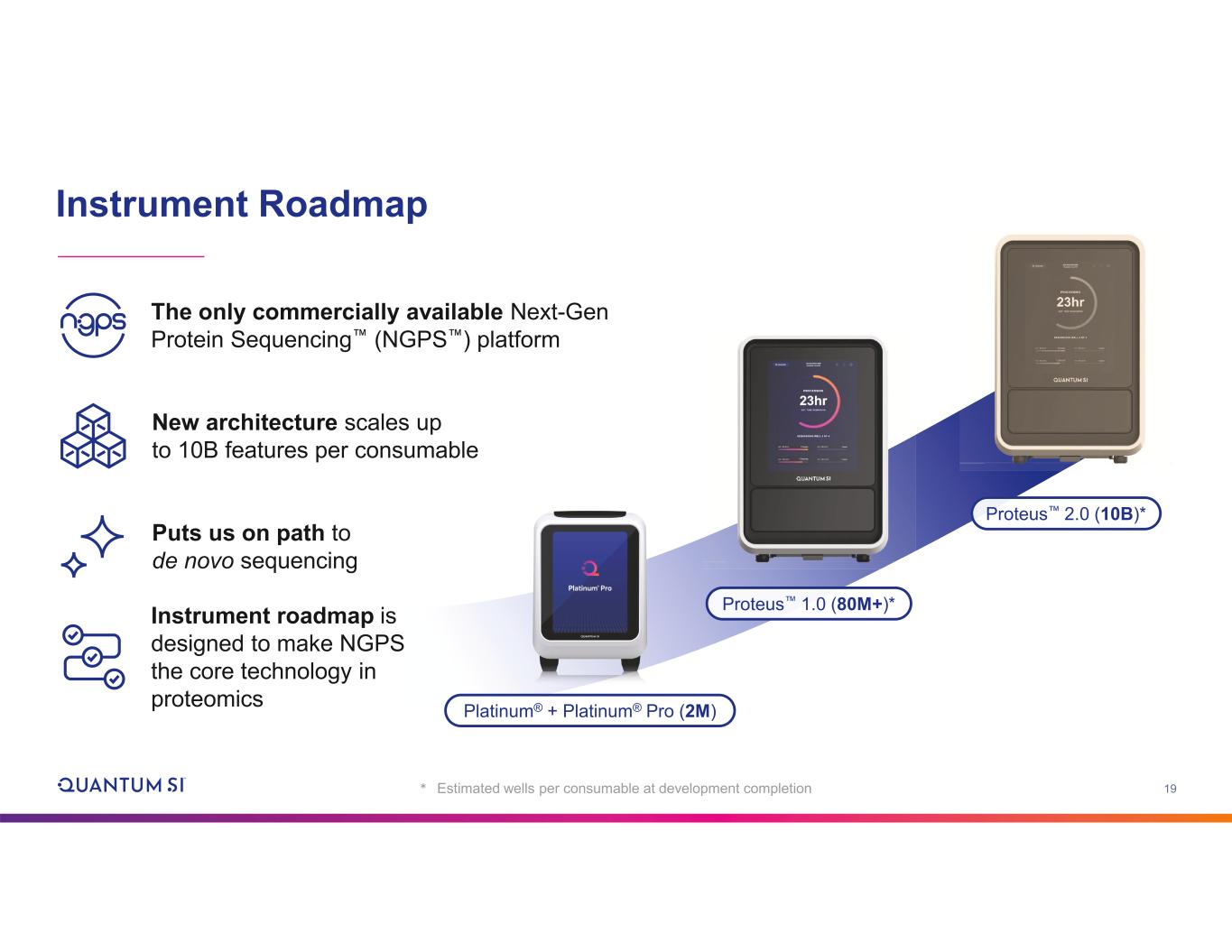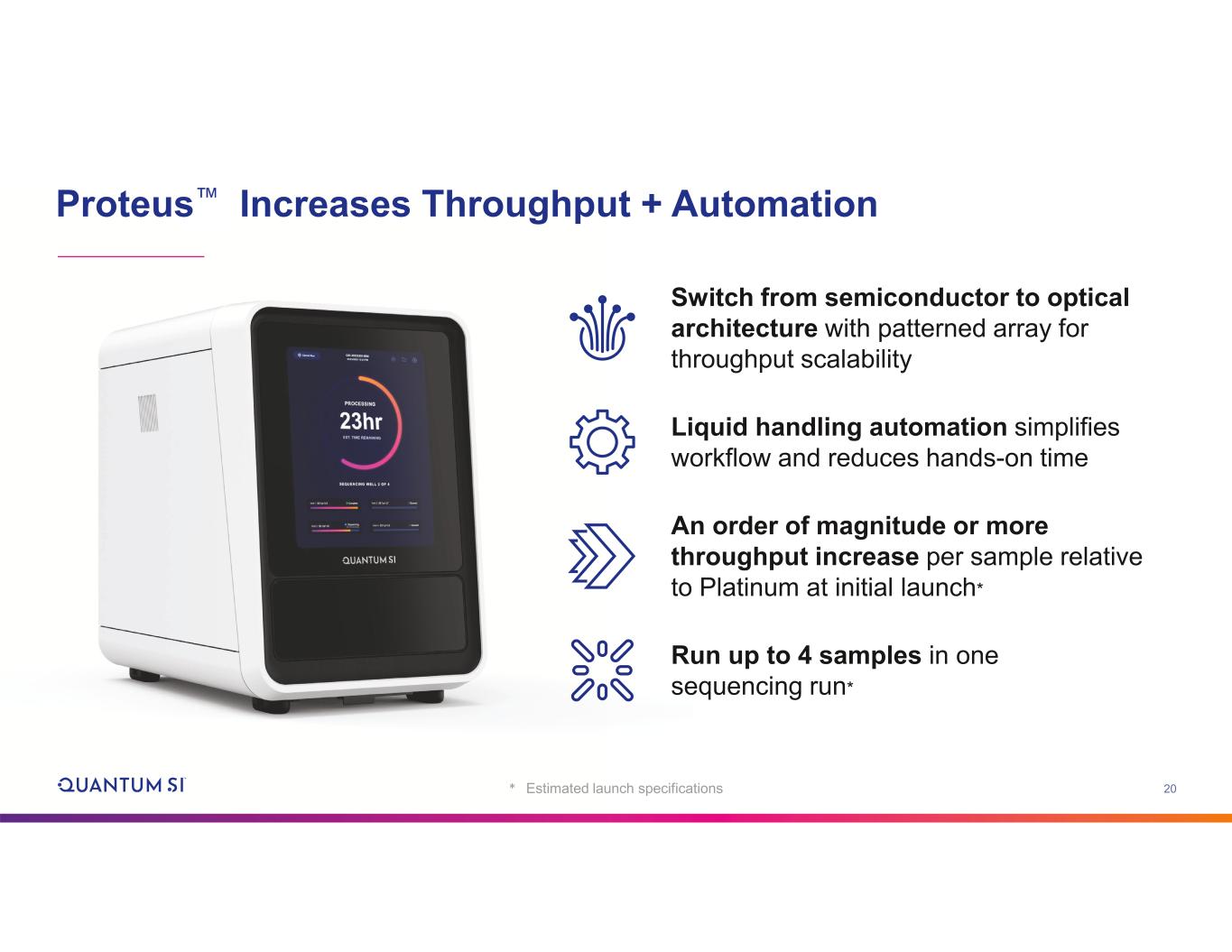 19 Instrument Roadmap Platinum® + Platinum® Pro (2M) Proteus 1.0 (80M+)* Proteus 2.0 (10B)* * Estimated wells per consumable at development completion New architecture scales up to 10B features per consumable Puts us on path to de novo sequencing The only commercially available Next-Gen Protein Sequencing (NGPS ) platform Instrument roadmap is designed to make NGPS the core technology in proteomics